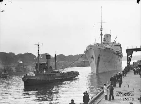A tug helps the British troopship, SS Andes, manoeuvre into Woolloomooloo Wharf, Sydney, with approximately 2000 RAAF personnel aboard on the 29th of July 1945.