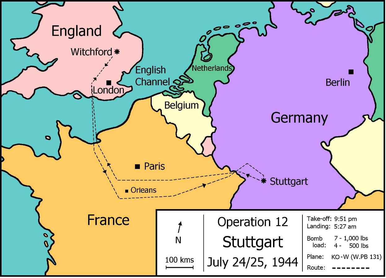 Map of the Stuttgart raid from the website of the WW2 Diary of Lancaster Pilot Bruce Johnston of the Royal Canadian Air Force.