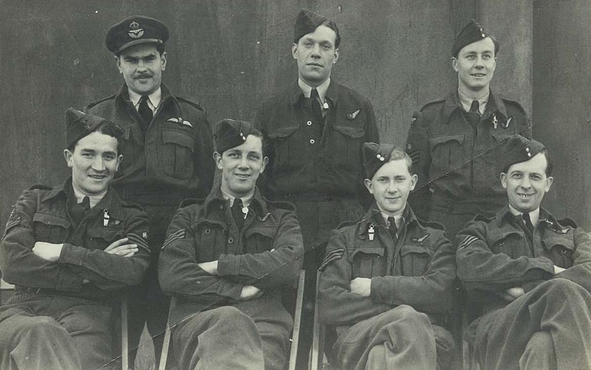 Standing: F/O A.F. Bannatyne - F/O A. Maxie McVicar (Aus) - P/O John Hodgson - Beckett - F/O Bill Petersen (NZ) - Ian Adams (NZ) - ??? - ???
